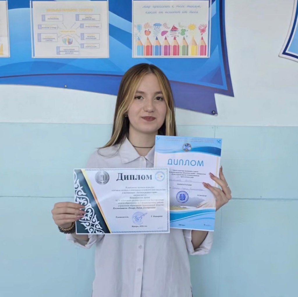 7-сынып оқушысы Кожевникова Арина «Табиғи өлкетану нысандары туралы үздік аңыз» атты аудандық сырттай байқауға қатысып, «Туған өлке аңызы» номинациясы бойынша құрметті II орынға ие болды.